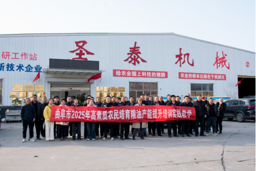 12月2日由曲阜市农业农村局科教科、农机管理科联合组织的 “曲阜市2025年高素质农民培育粮油产能提升培训实践教学”活动走进山东新圣泰机械制造有限公司。来自全市的种粮大户代表实地观摩新型农机装备,沉浸式体验农业机械化升级成果,为粮食生产与畜牧养殖提质增效探寻新路径。